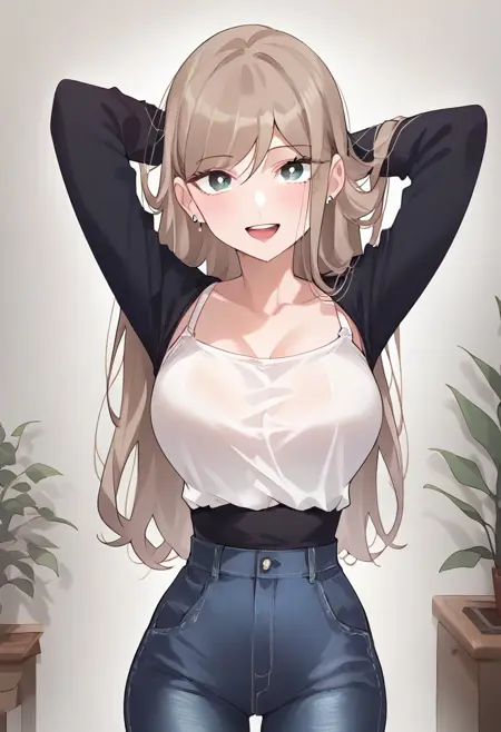 ((粉红色背心,露骨胸脯,巨大胸脯,露脐,长袖白色衬衫,短牛仔裤,黑色棒球帽,))