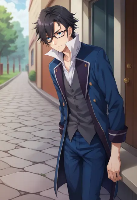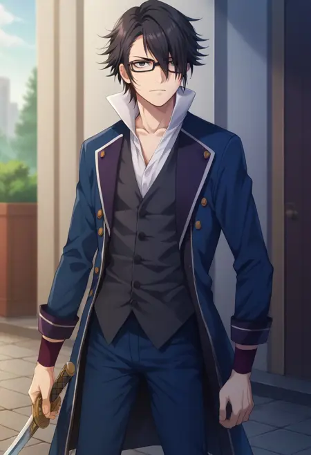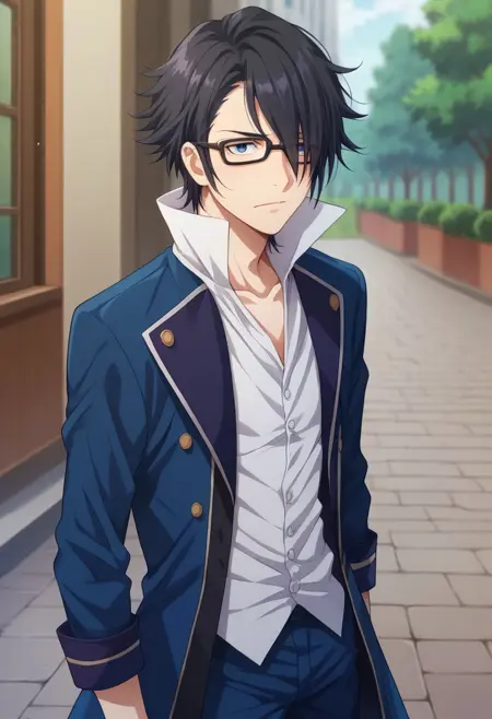saruhiko, 1boy, male focus, solo, black hair, hair over one eye, black eyes, glasses, shirt, white shirt, high collar, vest, jacket, blue jacket, coat, pants, blue pants, boots, knee boots, black footwear,