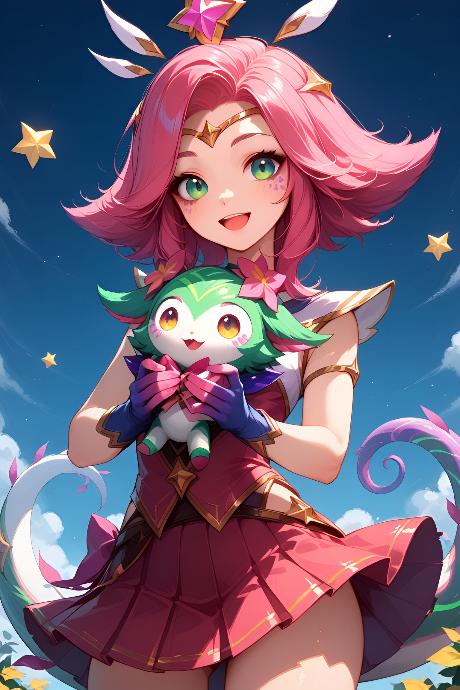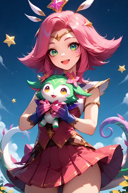 neeko, 1girl, star guardian (league of legends), 치마, 녹색 눈, 별(기호), 미소, 꼬리, 주름 치마, 빨간 치마, 손에 들고 있음, 벌린 입, 싱글, 녹색 머리카락, 빨간 머리카락, 동물 들고 있음, 분홍색 머리카락, :d, 다색 머리카락, 시청자 바라봄, 장갑