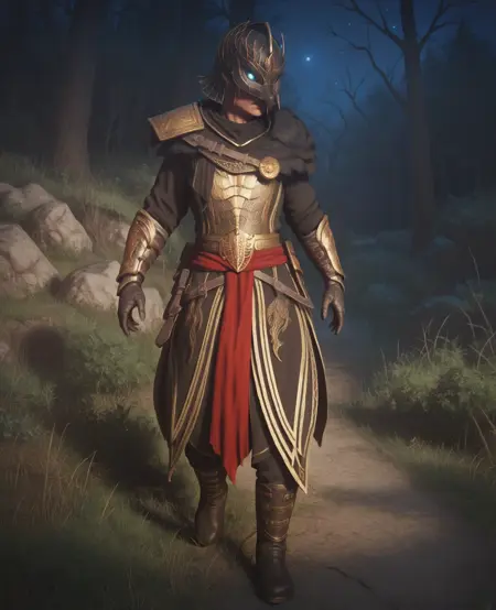 Bl4ckR4ven4rmor, armor, black robe, bracers, boots, red waist curtain, fur shoulder armor, helmet, glowing eyes