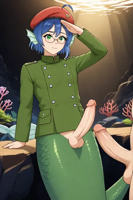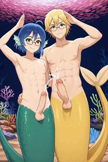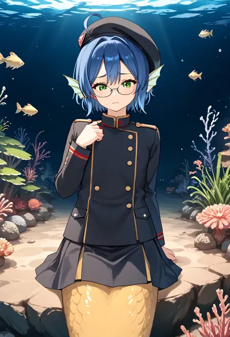 Appearance: blue hair, green eyes, ahoge, glasses, merman, mermaid tail, head fins, yellow tail