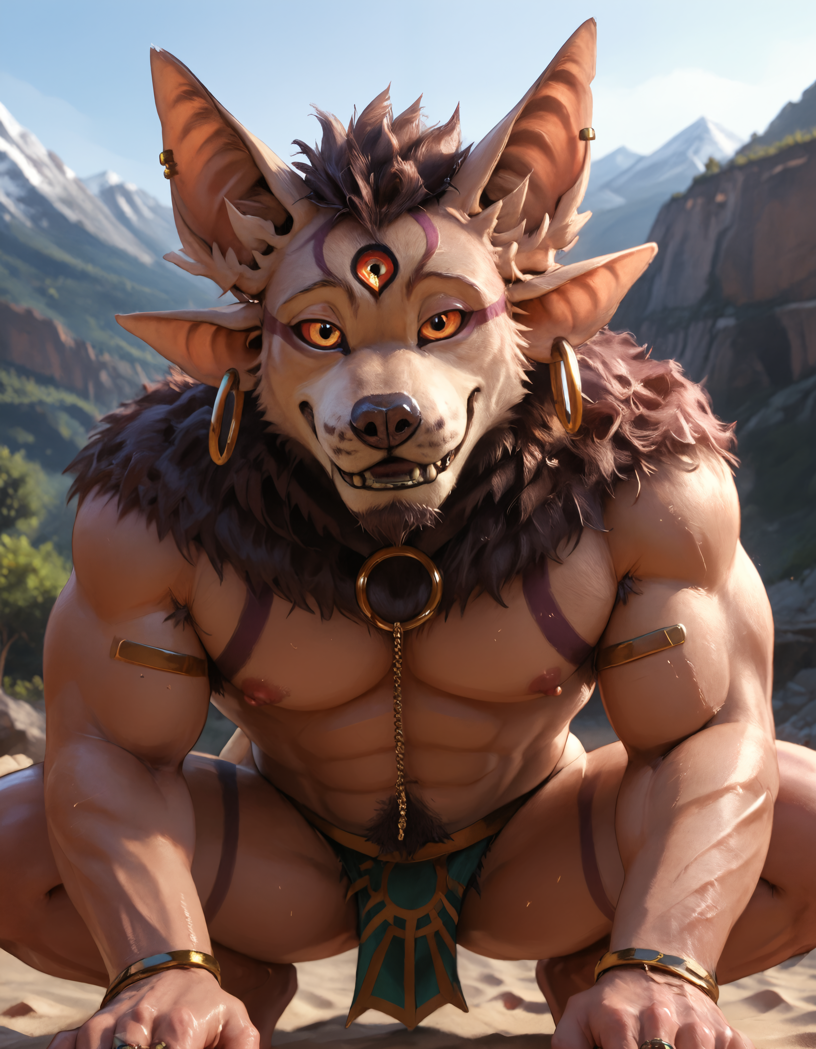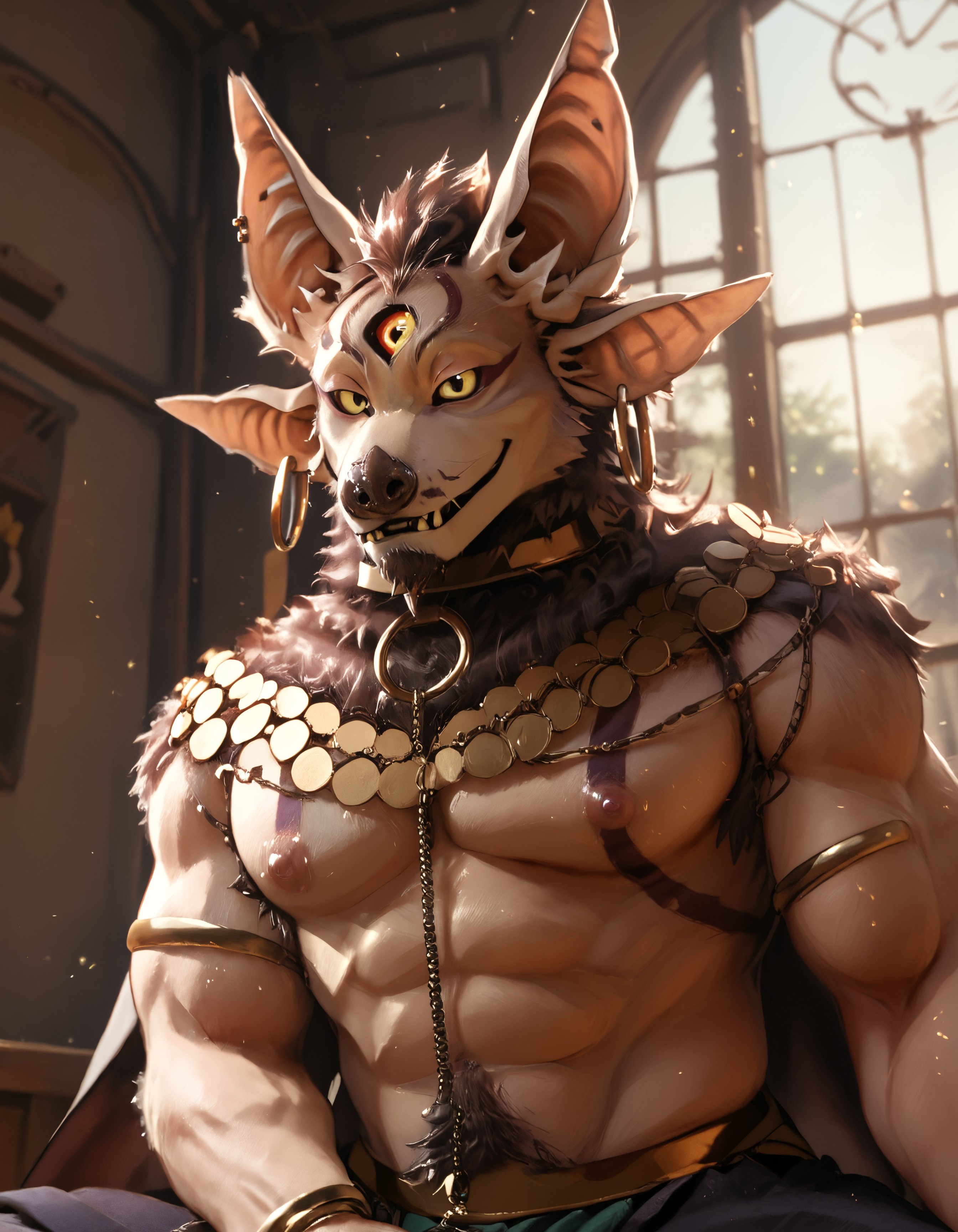 // 폰티: anothereidos, male, solo, 1boy, male focus, muscular, ear piercing, clothing, nipples, pectorals, ring piercing, detailed eyes, body fur, claws
