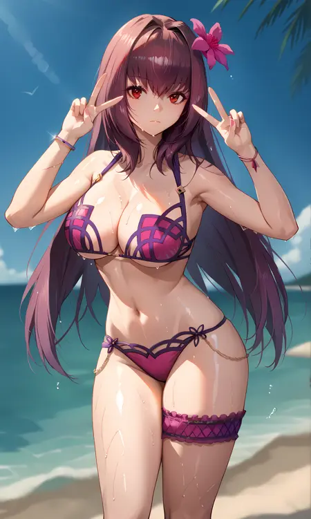 スカタッチ、赤い目、紫の髪、非常に長い髪
