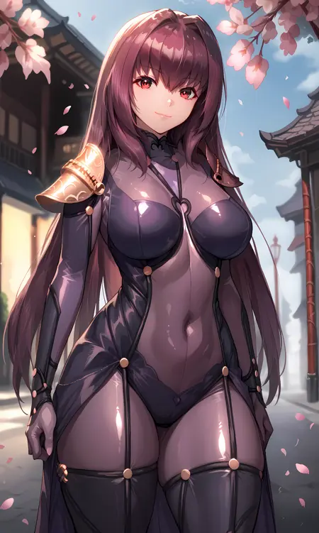 紫のボディスーツ、黒のボディスーツ、肌に密着、パウドロン、肩のアーマー、ハイヒール、黒の手袋