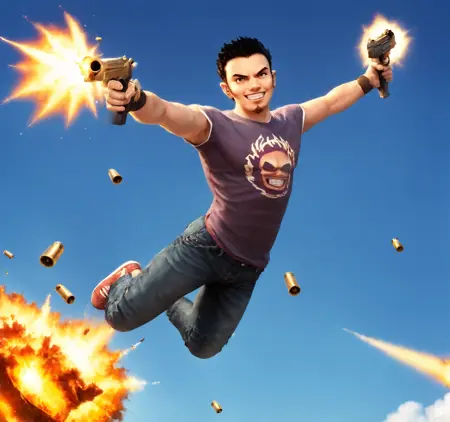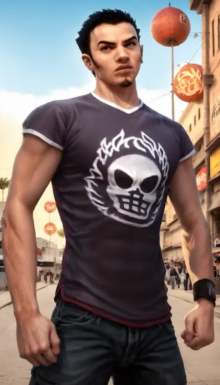 Ramiro Cruz 用のトリガー:RaCruz, 1boy, solo, foocus puple t-shirt, sideburns, short beard, short hair, black hair, holding gun