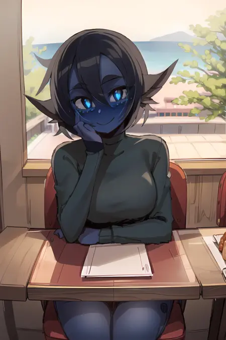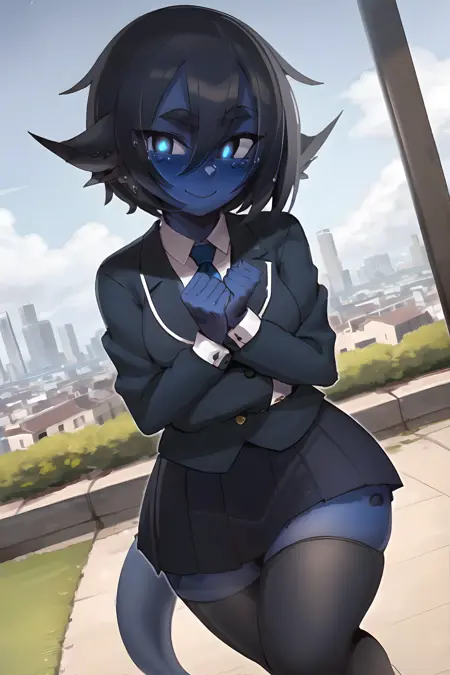 Triggers are Smouldie mainly, then the rest ; 1girl, blue skin, masterpiece, best quality, short hair, (tail)