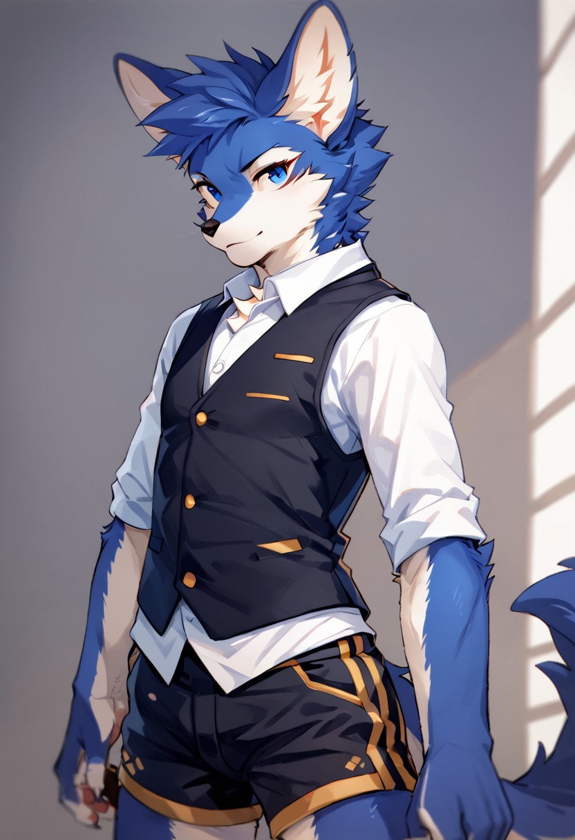 Pony: score_9, score_8_up, score_7_up, score_6_up, score_5_up, score_4_up, lenowoof, b1uew01f, 1boy, solo, furry male, furry, blue hair, blue eyes, two-tone fur, ...your tags...