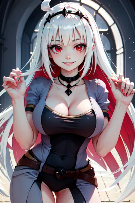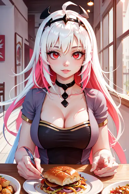 colored inner hair, pink colored inner hair, red eyes, white hair, huge breasts