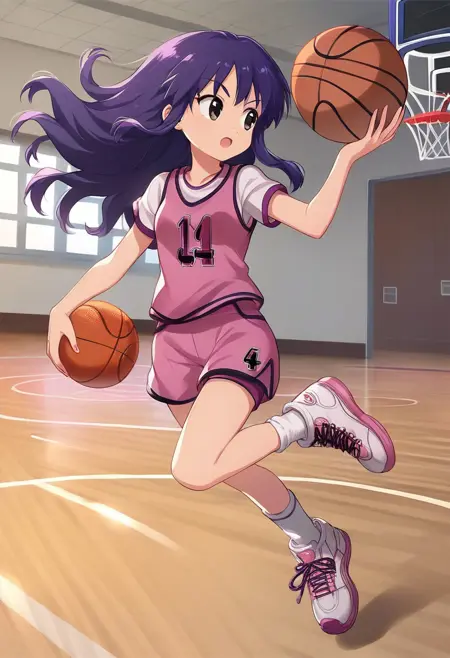 Rin: Orochi_GF, black eyes, Rin_GF, purple hair, long hair, sidelocks, basketball uniform, basketball jersey, pink basketball jersey, sportswear, sleeveless, short sleeves, short sleeves under sleeveless, number print, clothes writing, shorts, pink shorts, short socks, white socks, sneakers, white footwear,
