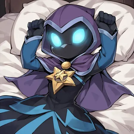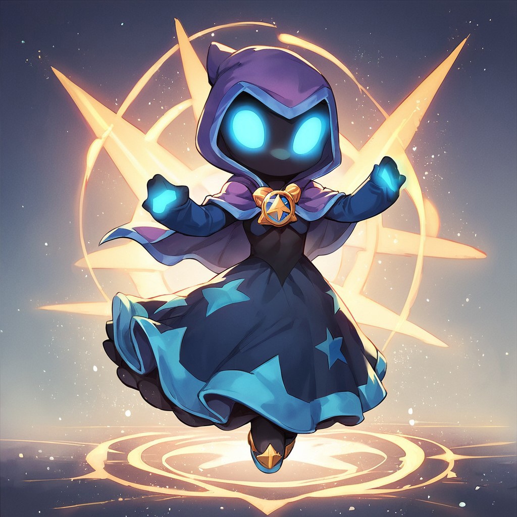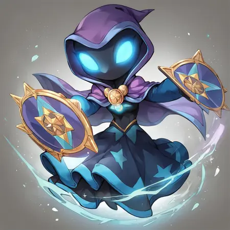 Star strike (skylanders), purple hood cape, blue sleeves, blue star dress, star amulet, glowing blue eyes, holding fans in both hands, black skin, no mouth,