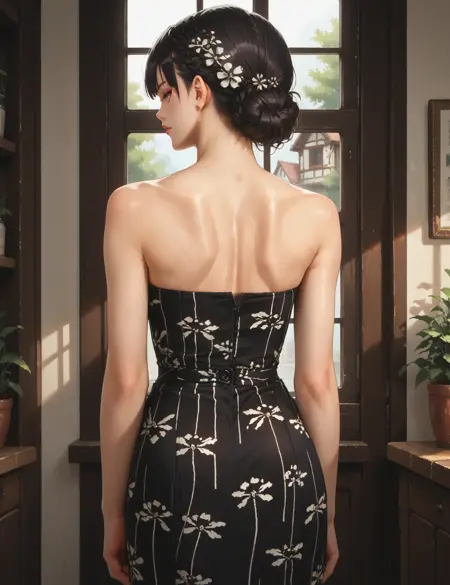 black dress, white pattern, print, bare shoulders, strapless, sleeveless