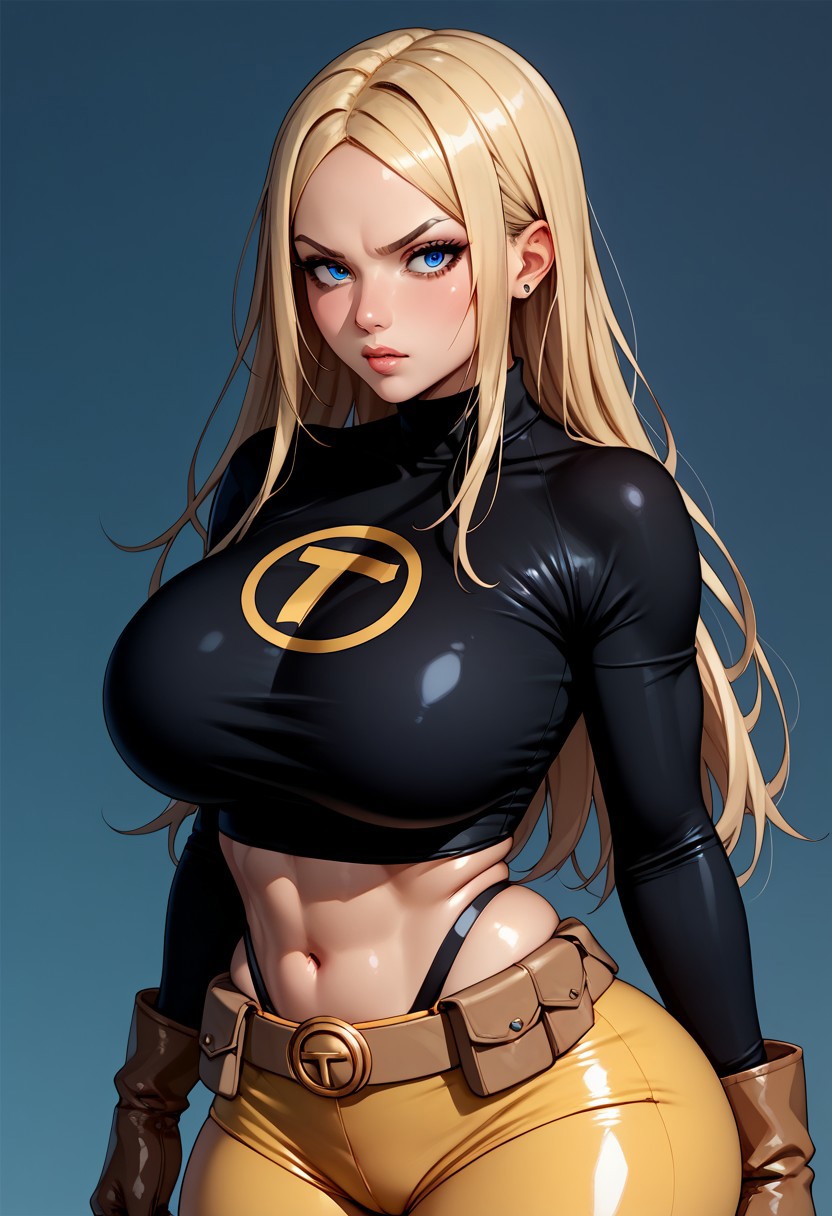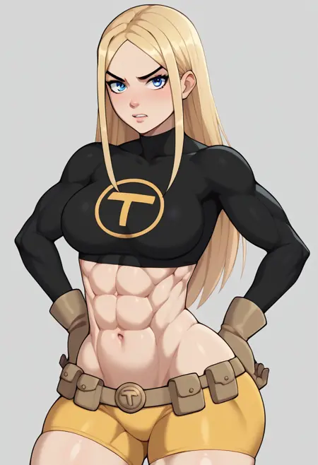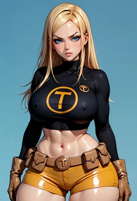 TerraTT, 1girl, blonde hair, long hair, blue eyes, forehead, parted bangs, black shirt, long sleeves, turtleneck, midriff, navel, yellow shorts, biker shorts, brown belt, brown gloves, skintight shirt, brown shoes