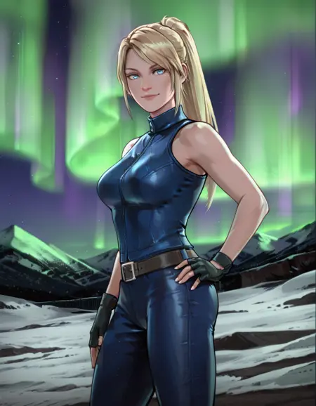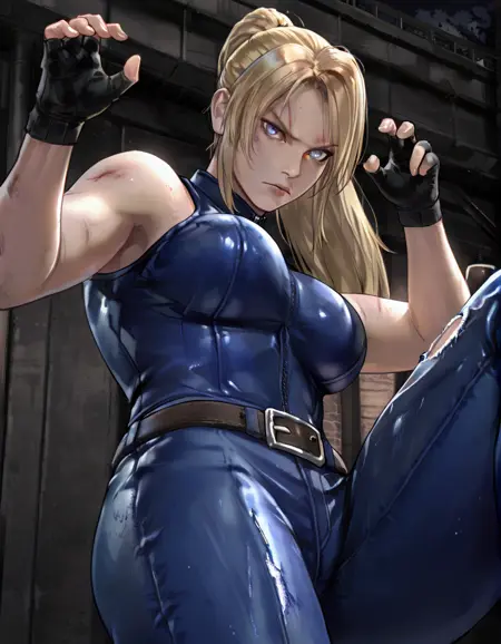 blue bodysuit, or blue vest, belt ,sleeveless, boots, earrings, fingerless gloves,