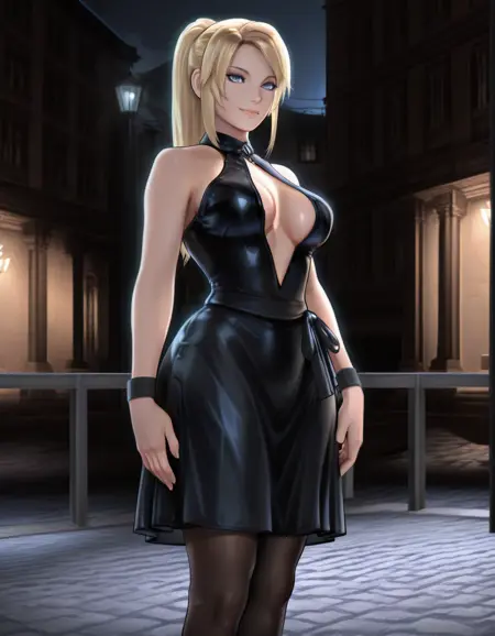 has some black dress training - black dress, cleavage, gem, black thigh highs, --- black dress skirt, or skirt, if needed - PUT dress, in NEG if attire is altered from it
