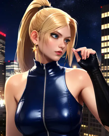 蓝色紧身衣,或蓝色背心,腰带,无袖,靴子,耳环,露指手套,