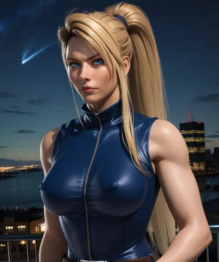 青いボディスーツ、または青いベスト、ベルト、ノースリーブ、ブーツ、イヤリング、フィンガーレスグローブ