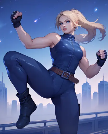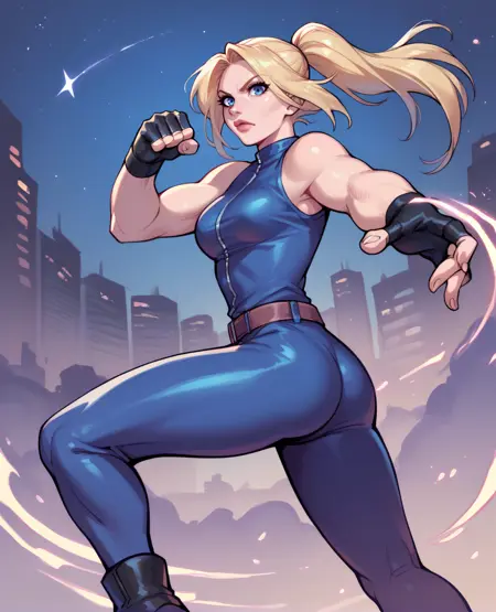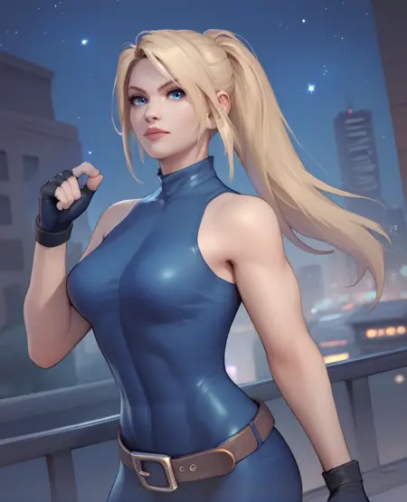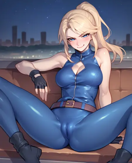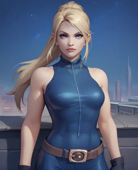파란 수트, 또는 파란 트렌치, 벨트, 스웨터 없는 디자인, 부츠, 귀걸이, 손가락 없는 장갑,