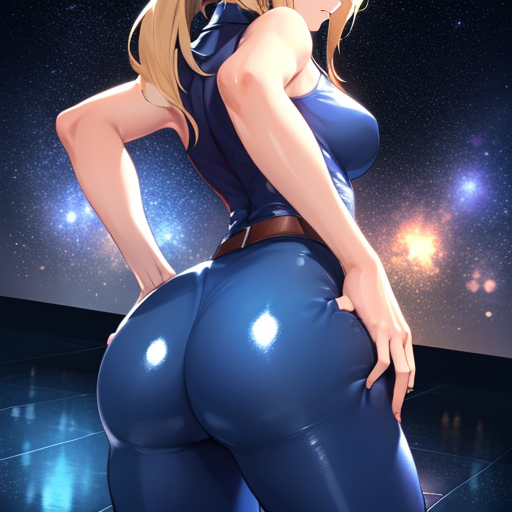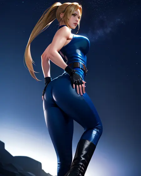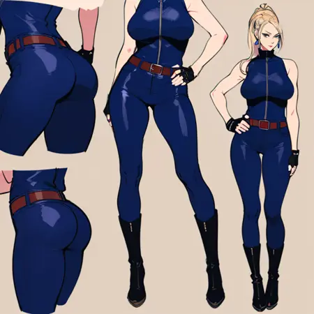 青いボディスーツ、または青いベスト、ベルト、袖なし、ブーツ、イヤリング、指なし手袋、