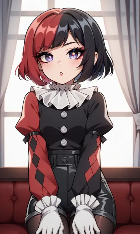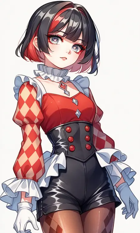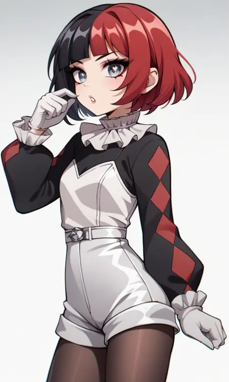 | Trained Words | 1girl, multicolored hair, two-tone hair, black hair, red hair, black leotard, shorts, long sleeves, ruffled jester collar, ruffle white wrists, white gloves, makeup,argyle sleeves, Bob cut, white eyes, diamond-shaped pupils, black pantyhose, split-color hairCopied! |