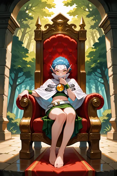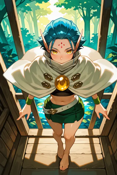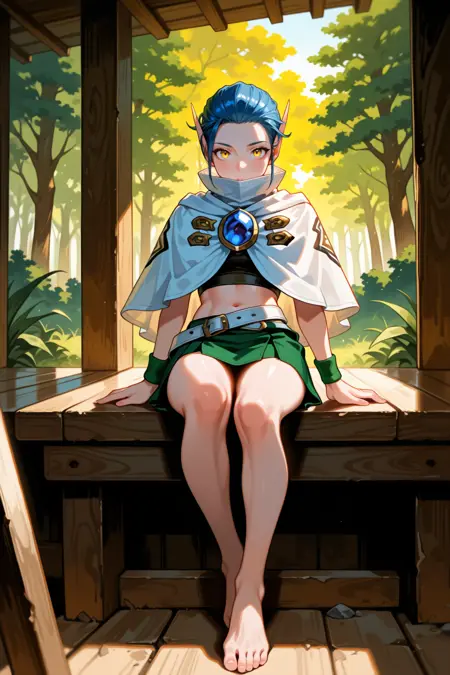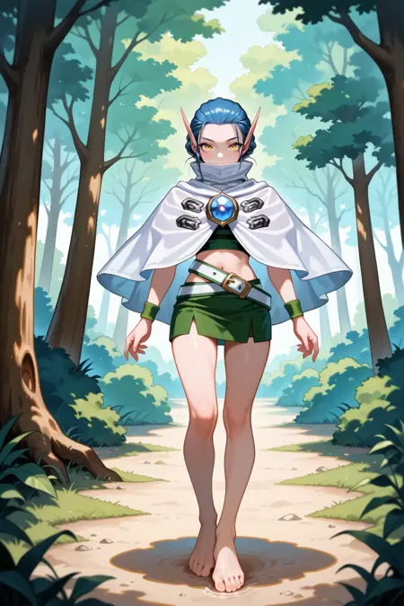 엘프 루드: 3lf1ord, 1girl, blue hair, short hair, hair slicked back, pointy ears, yellow eyes, forehead mark, facial mark, barefoot, covered mouth, popped collar, capelet, white capelet, skirt, green skirt, midriff, wristband, green wristband, crossed belts, white belt,