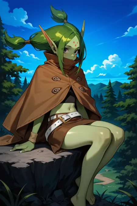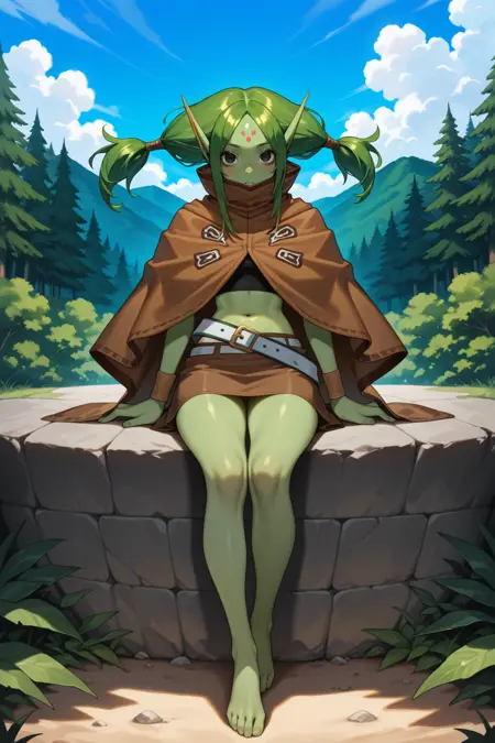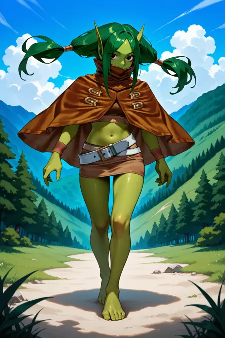 엘프: 3lfdef, 1girl, green hair, twintails, sidelocks, colored skin, green skin, pointy ears, black eyes, forehead mark, facial mark, barefoot, covered mouth, popped collar, capelet, brown capelet, skirt, brown skirt, midriff, wristband, brown wristband, white belt,