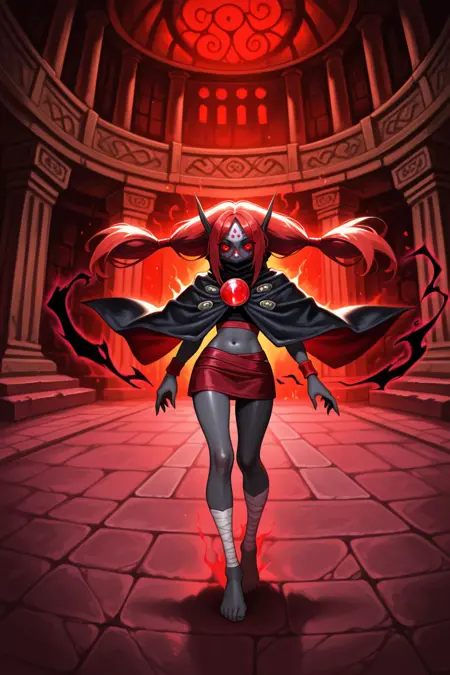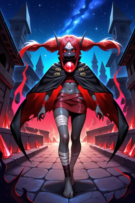 다크 엘프: 3lfd4rk, 1girl, red hair, twintails, sidelocks, colored skin, grey skin, pointy ears, red eyes, red sclera, glowing eyes, forehead mark, facial mark, facepaint, barefoot, covered mouth, popped collar, capelet, black capelet, skirt, red skirt, midriff, wristband, red wristband, bandaged leg,