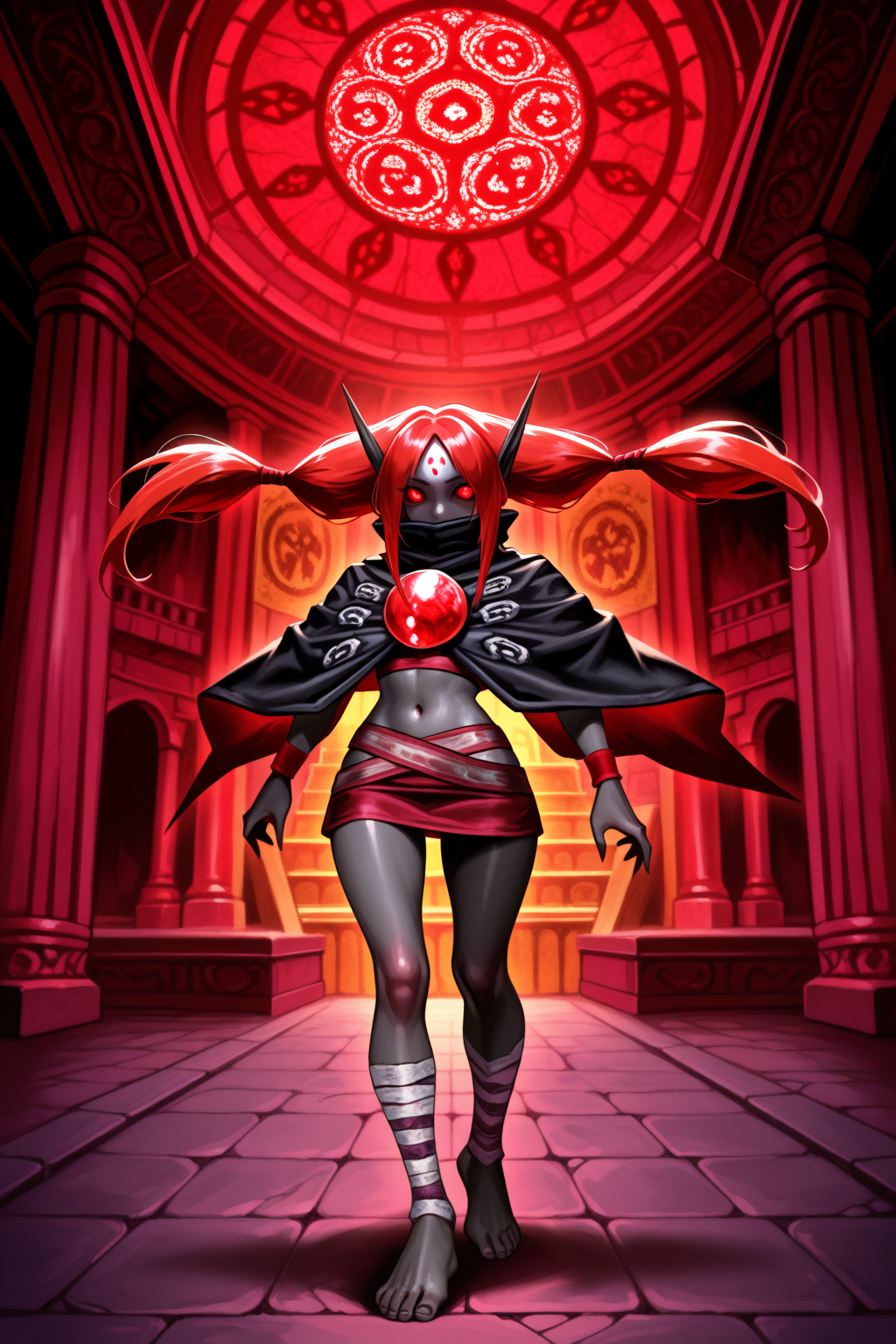 다크 엘프: 3lfd4rk, 1girl, red eyes, red sclera, glowing eyes, red hair, twintails, sidelocks, colored skin, grey skin, pointy ears, facial tattoo, covered mouth, popped collar, black capelet, midriff, red skirt, red wristband, bandaged leg, barefoot