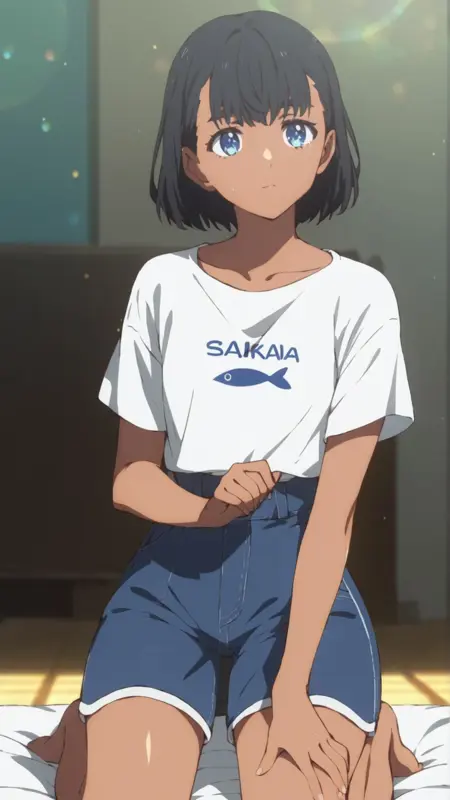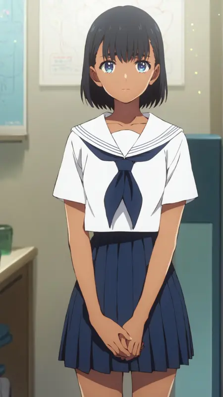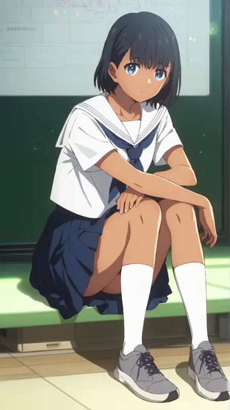 추천 프롬프트: "mio_kofune, an anime girl, 1girl, solo, looking at viewer, short hair, bangs, blue eyes, skirt, shirt, black hair, closed mouth, school uniform, standing, collarbone, full body, white shirt, short sleeves, pleated skirt, shoes, serafuku, socks, dark skin, sailor collar, dark-skinned female, blue skirt, neckerchief, kneehighs, tan, white socks, sneakers, white sailor collar, blue neckerchief, grey footwear"