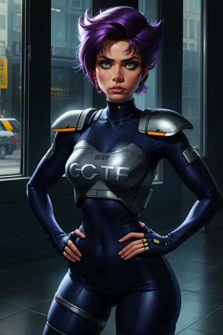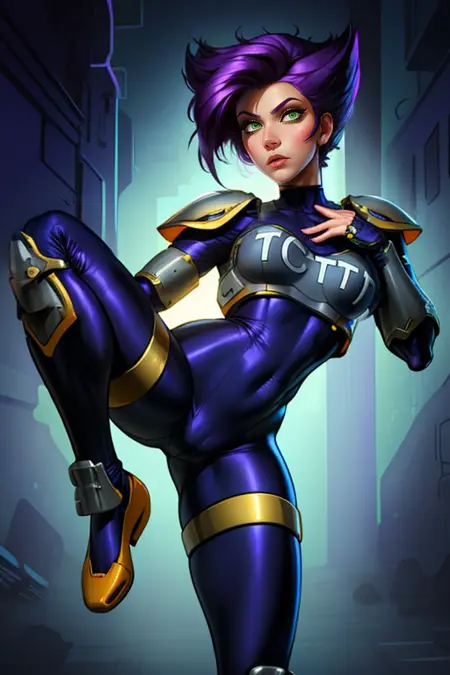 スパイクヘア、紫の髪に前髪、キレッとしたヘアスタイルなどを試してみる。正確な髪型に近づくかもしれませんが、アーマーにスパイクが付く可能性があるため、その場合 spiky armor、spikes をNegに加えるとよい