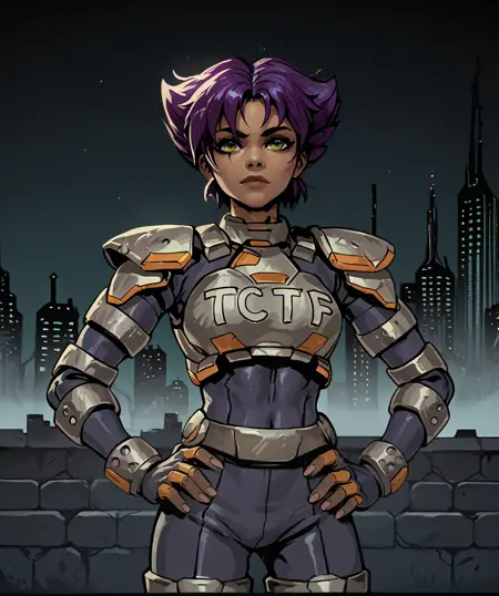 can try - spiked hairstyle, or purple hair with bangs, or sharp hairstyle, - to try and get accurate hairstyle but it may add spikes to armor, can add - spiky armor, spikes, in neg if so