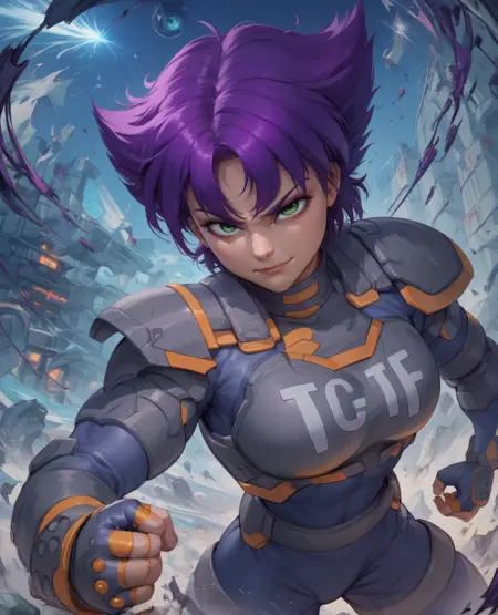 可尝试“刺状发型”或“带刘海的紫色头发”或“利落发型”以更准确还原发型,但可能会在盔甲上出现尖刺,若出现此情况,可在负向提示中加入“尖刺盔甲”或“尖刺”