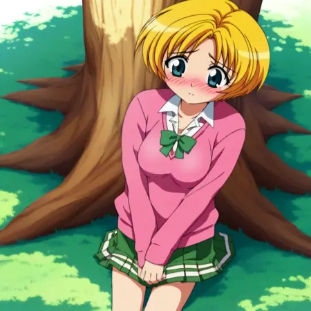 muyi_yki, blonde_hair, short hair, school uniform, necktie, sweater, skirt