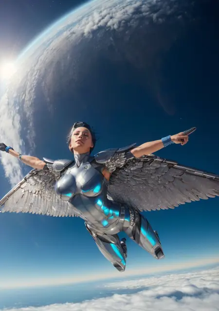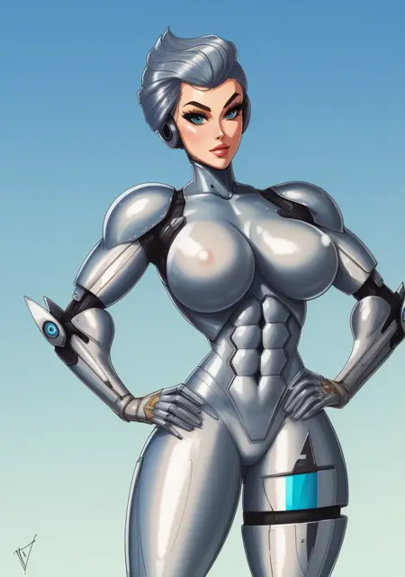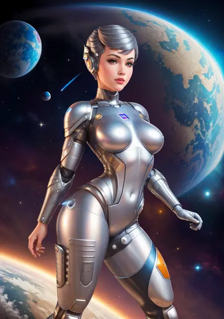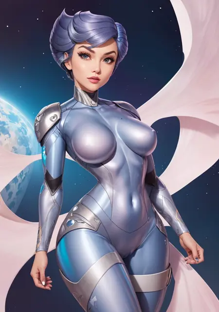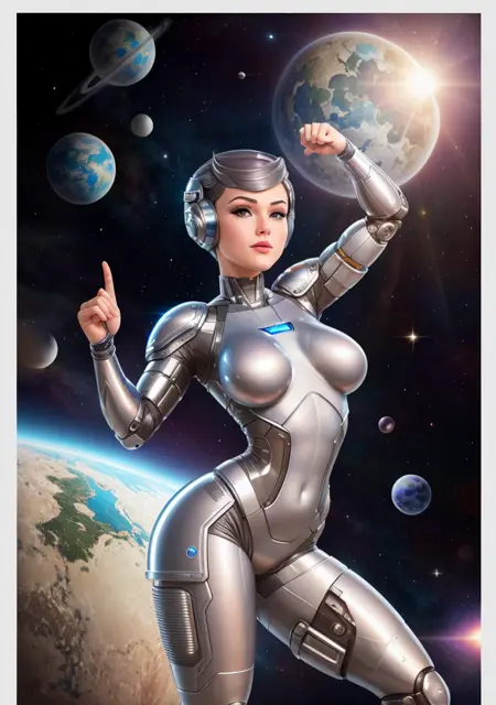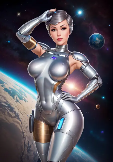(masterpiece, best quality, high resolution), (1human arm:1.3), (cyborg:0.8), 纹理复杂的紧身衣, 贴身银色铠甲, (cartoon:1.3), (SteelHeartQuiron 角色), 1girl, solo, 肌肉发达的腿部, 肚肌, (银色金属短发:1.5), 金属感未来风格紧身衣, 科幻风格, 握紧的拳头, 一位身穿太空服的卡通女性特写, 作为复古未来主义英雄, 具有艺术装饰风的太空女性形象, 灵感来自 Rob Liefeld, 科幻女性, 作为复古未来主义英雄, 60年代科幻风格美人海报风格, 宇宙中的赛博格女神, 美丽的赛博格女孩海报, lyco:quiron_SilverHeart_V3Lycoris:1.0