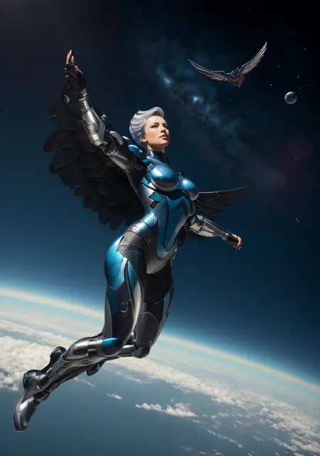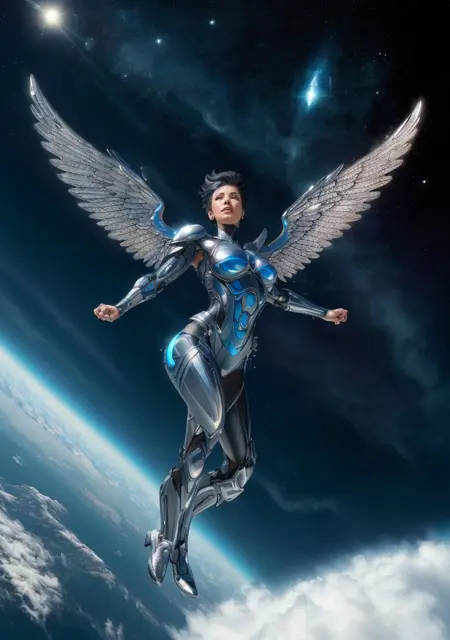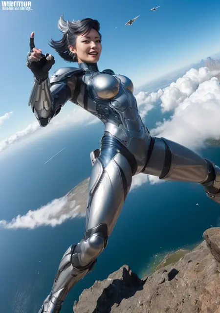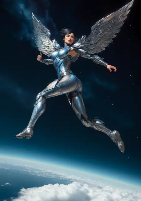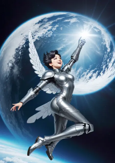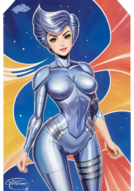 📝🌟 触发词:(SteelHeartQuiron 角色), lyco:quiron_SilverHeart_V3Lycoris:1.0, (银色金属短发), 金属感未来风格紧身衣, 科幻风格, 1980年代 (风格), 复古艺术风格,