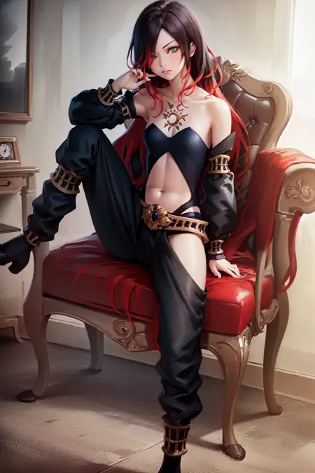 默认服装: 服装裁切,肚脐裁切,分离袖子,臀部开缝,腰带,裸露肩膀