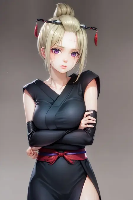 트리거 + 외모: tsukuyo, 턱에 흉터, 접힌 줄무늬 머리끈, 머리 장식, 보라색 눈