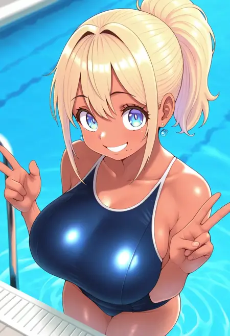 Misora Haebaru, 嘴下有痣,金发,痣,耳环,蓝眼睛,深色皮肤,深色皮肤女性,马尾