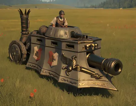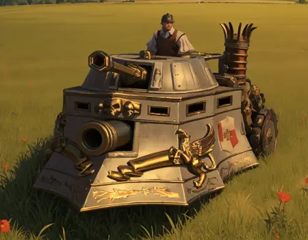 蒸汽坦克配备了一门蒸汽动力火炮,可发射高速旋转的铁球,直冲敌阵。此外还标配一门 turret 安装的蒸汽枪,能喷涌出大量灼热蒸汽,吞噬附近的敌人。”
