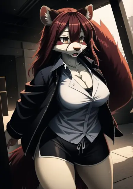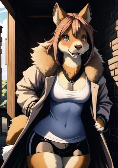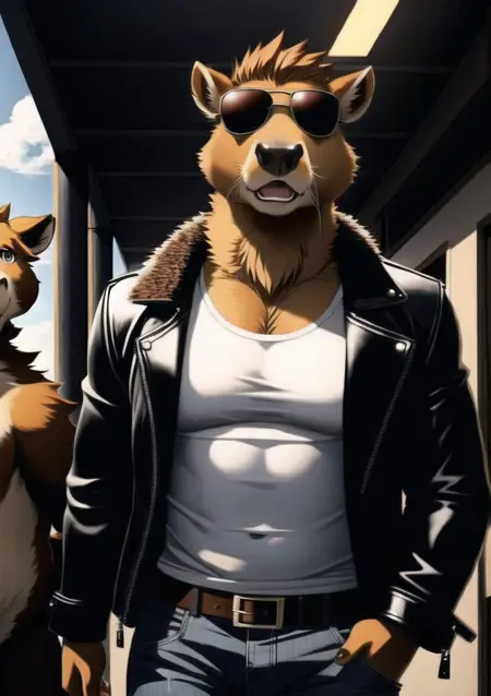 提示词:一位美丽的雌性耳廓狐,有长鼻,棕色旧皮夹克,帆布裤,白色内搭,黑色领圈,狡黠,帅气姿势,精致面部,精细双眼,美丽,短(波浪)发