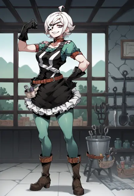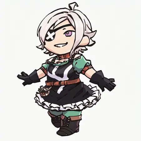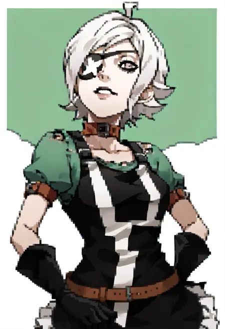 - Default appearance: tara, white hair, short hair, ahoge, lavender eyes, eyepatch, collar, black pinafore dress, green shirt, puffy short sleeves, black gloves, brown belt, belt pouch, frills