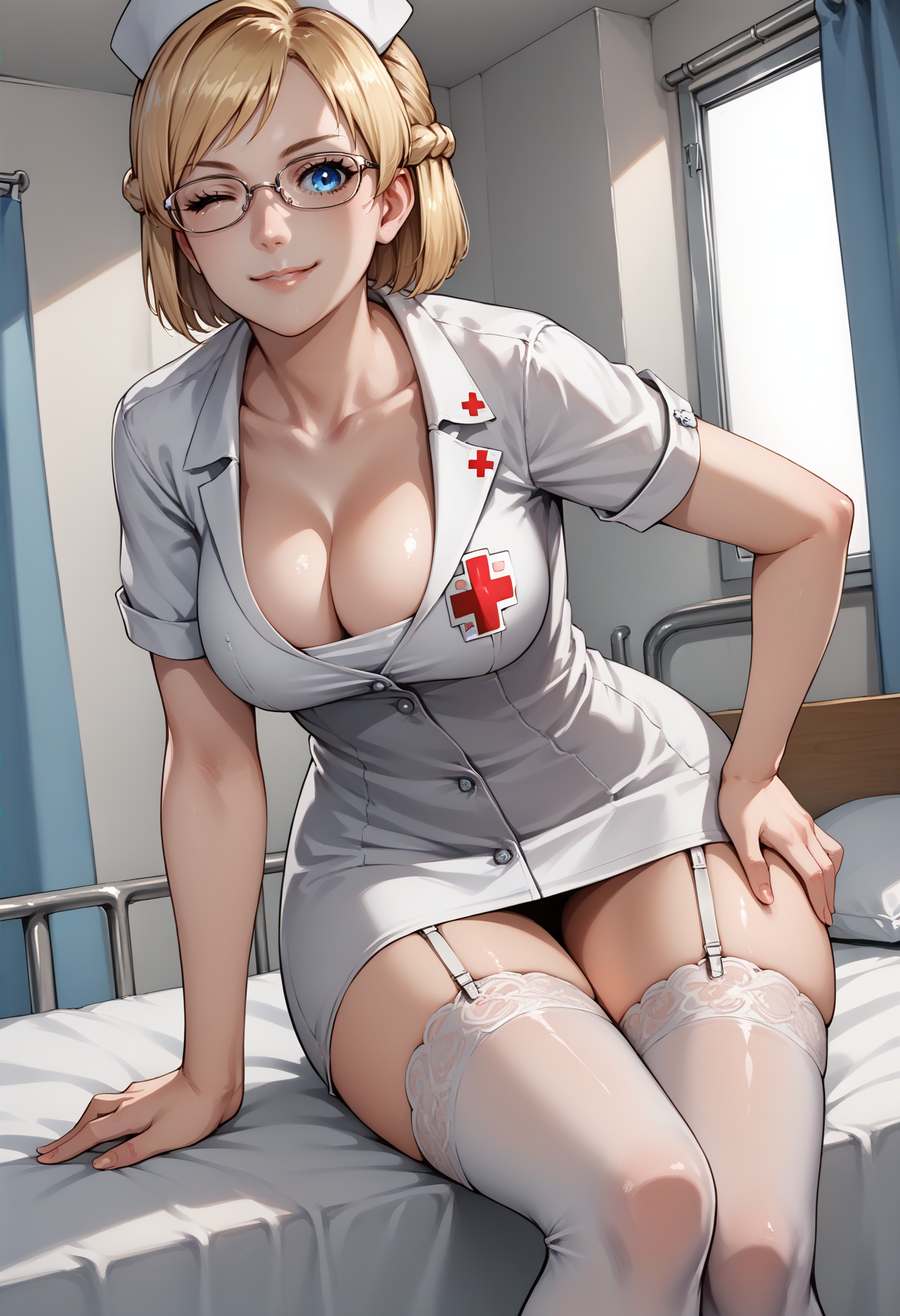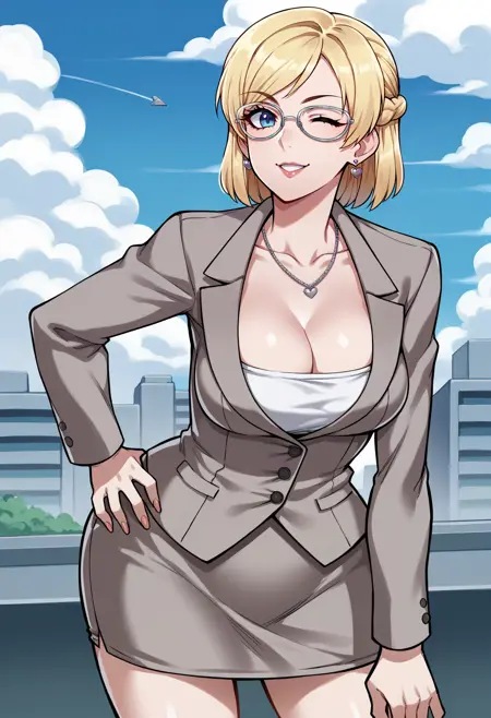 j3ssie, blonde hair, short hair, french braid, glasses, blue eyes, lipstick, heart earrings, heart necklace, suit, formal, grey jacket, long sleeves, large breasts, cleavage, white shirt, pencil skirt