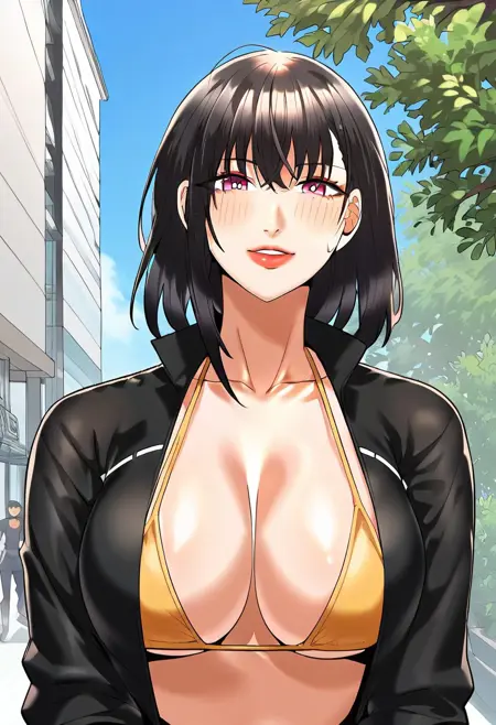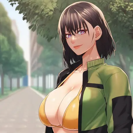 ((性感黑色运动夹克,暴露的乳沟,巨大的乳沟,性感黄色比基尼上衣,性感黄色比基尼下装,))