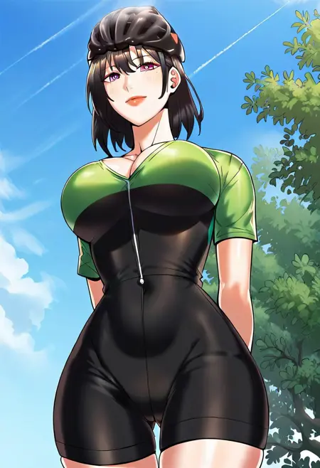 ((短袖绿色骑行上衣配黑色图案,黑色骑行短裤,)) + 黑色骑行头盔,