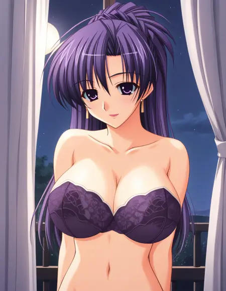 sumeragi sayaka, 紫色头发,马尾辫,紫色眼睛,金色耳环,嘴唇,成熟女性