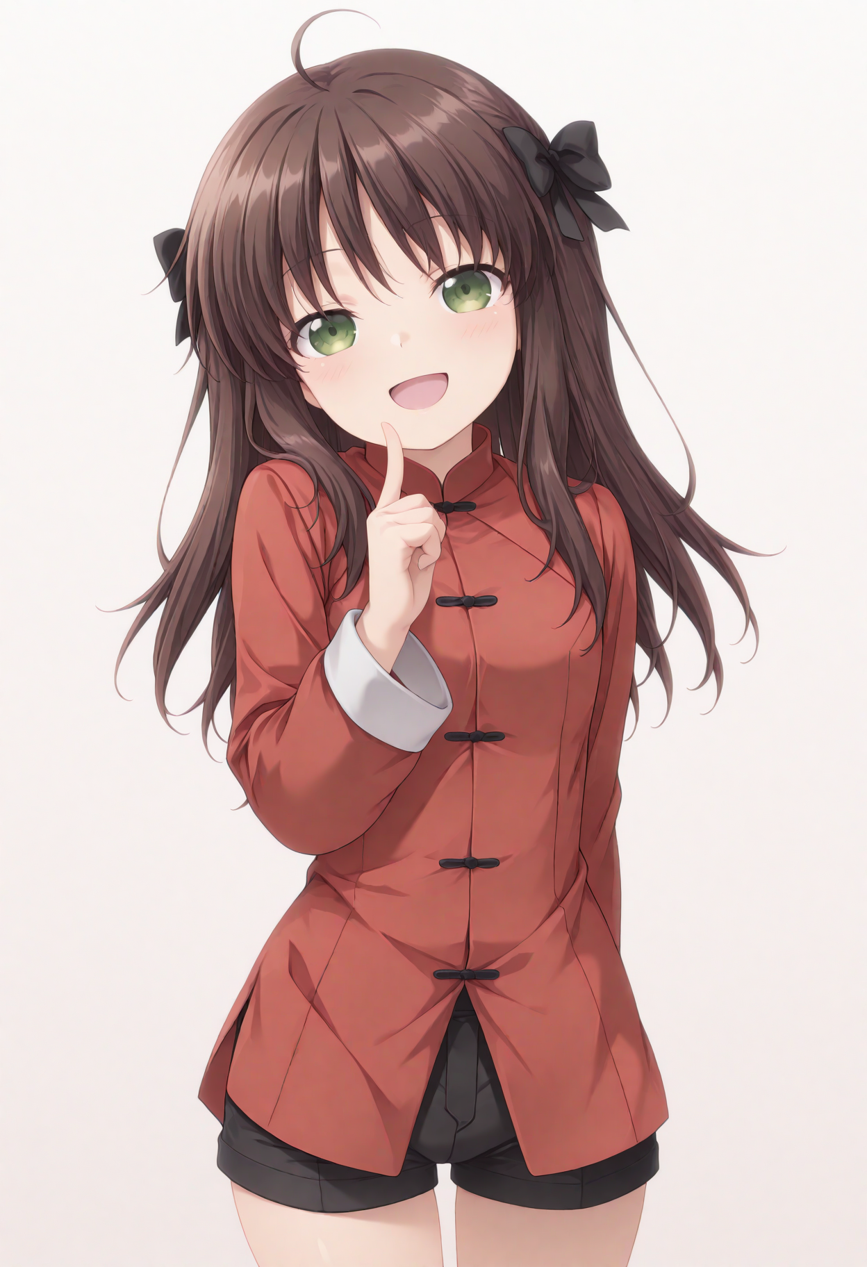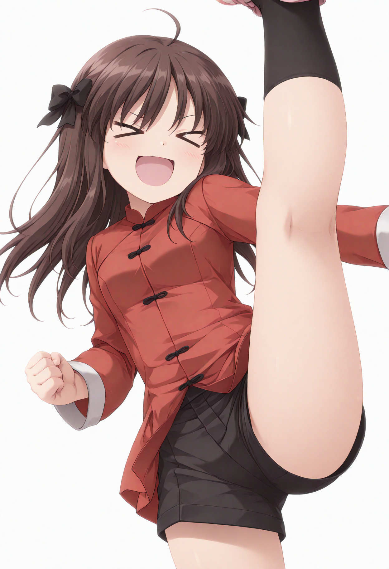 衣装: 赤い中国服、黒いショートパンツ、黒い靴下、ピンクの履物,