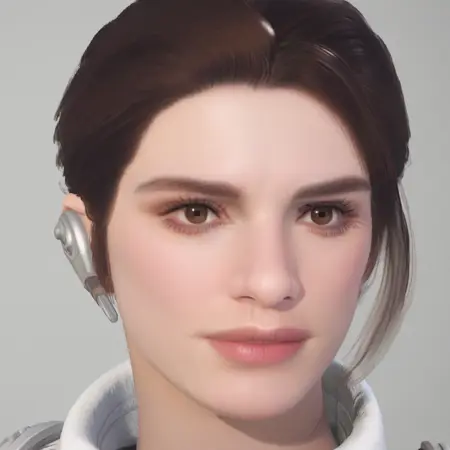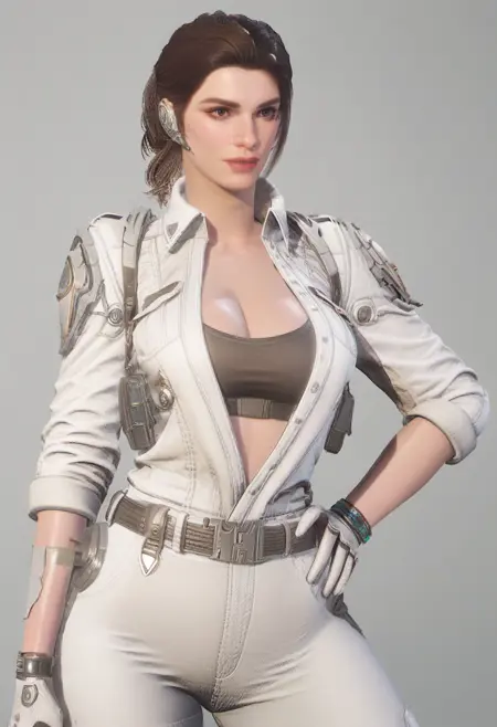 hailey, brown hair, brown eyes, breasts, gloves, cleavage, boots, hand on hip, belt, ponytail, weapon, short hair, white gloves, gun, high heels