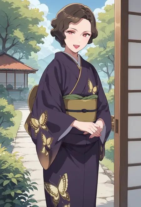 saimorikanoko, short hair, brown hair, eyeshadow, red eyes, lipstick, curly hair , single hair bun, mature female,