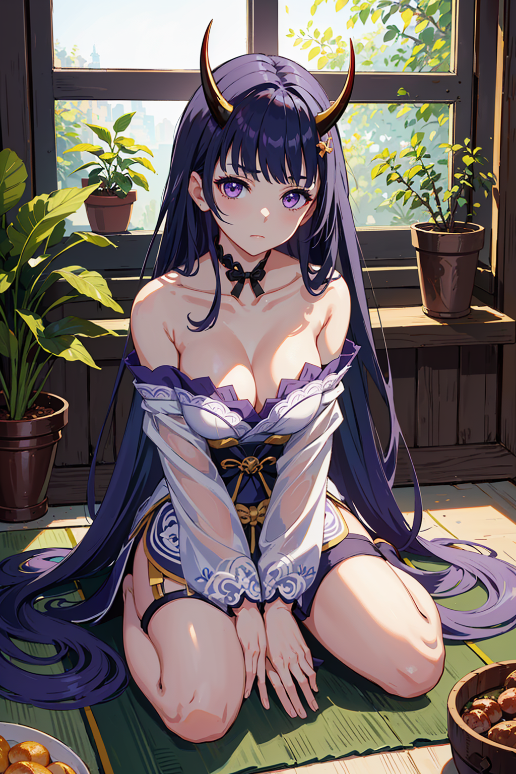 一如既往的介绍。"yae"是触发词,添加"very long hair,purple horns,hairpin,hair bun,earrings,purple bodystocking,detached sleeves,purple gloves,pelvic curtain,white tassel,high heels,see-through,breast curtains"来获得更好的输出。推荐权重0.8,更换服装需要降低权重到0.6,保留头部相关提示词和触发词即可。已知问题有:模型并不能很好的识别角的数量,可能会出现多个角。腰部的流苏挂饰具有不确定性。发髻可能出现在头的一侧而不是正后方,可以考虑去掉"hair bun"选择不生成这个烦人的发髻。如果你的Yae看起来不那么的成熟,添加"mature female,large breasts"即可。训练素材为纯黑背景,使用时需适当添加背景描述词。添加”glasses“来获得夜雨春澜的眼睛~