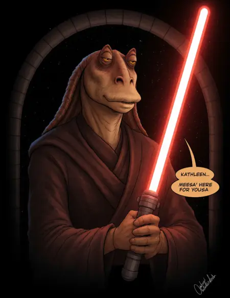 冗談はさておき、このLoRAは、スター・ウォーズのジャーリー・ビンクスの外見を再現するために設計されていますが、有名な転換として(ファンが推測する)シスの領主として描かれます。