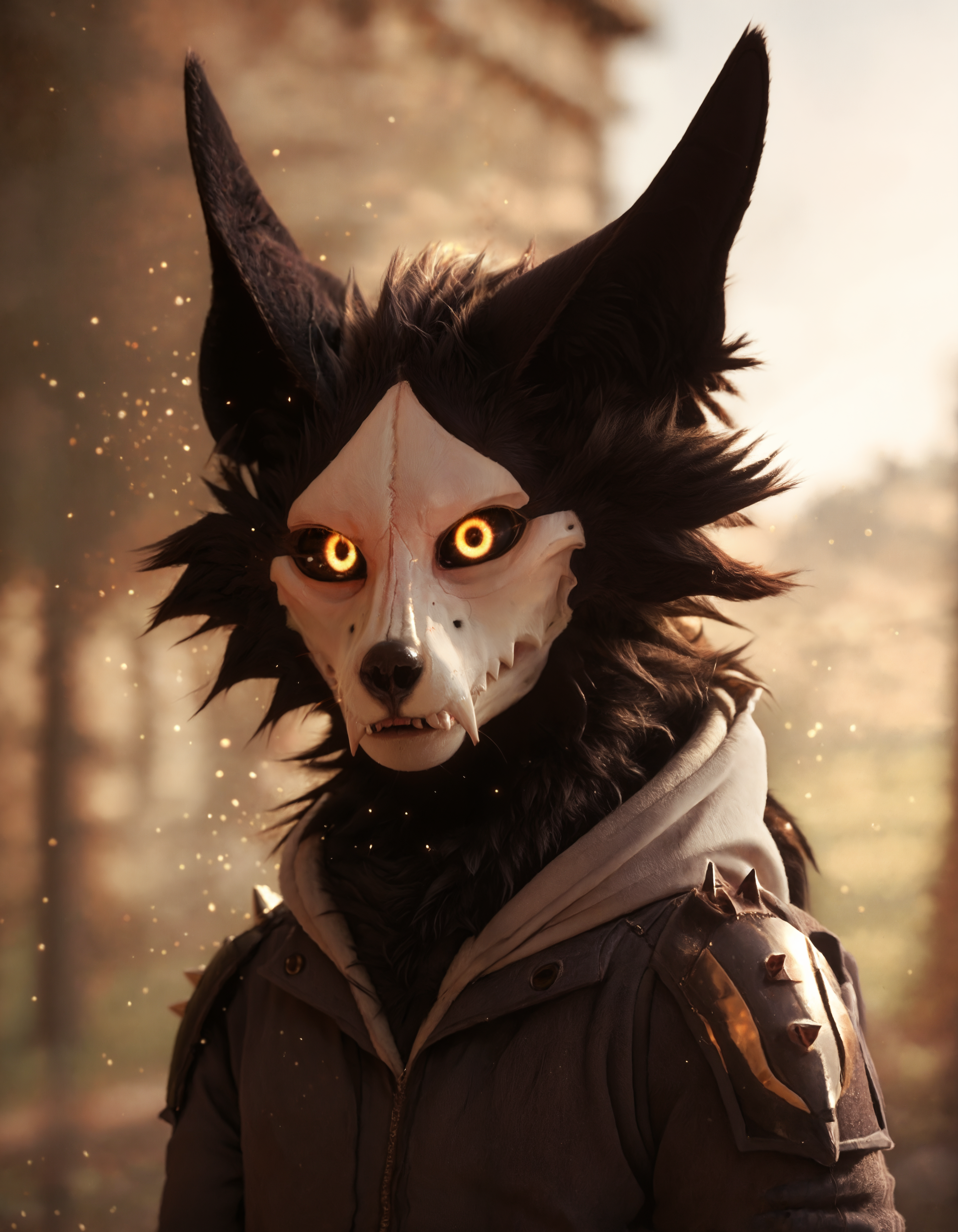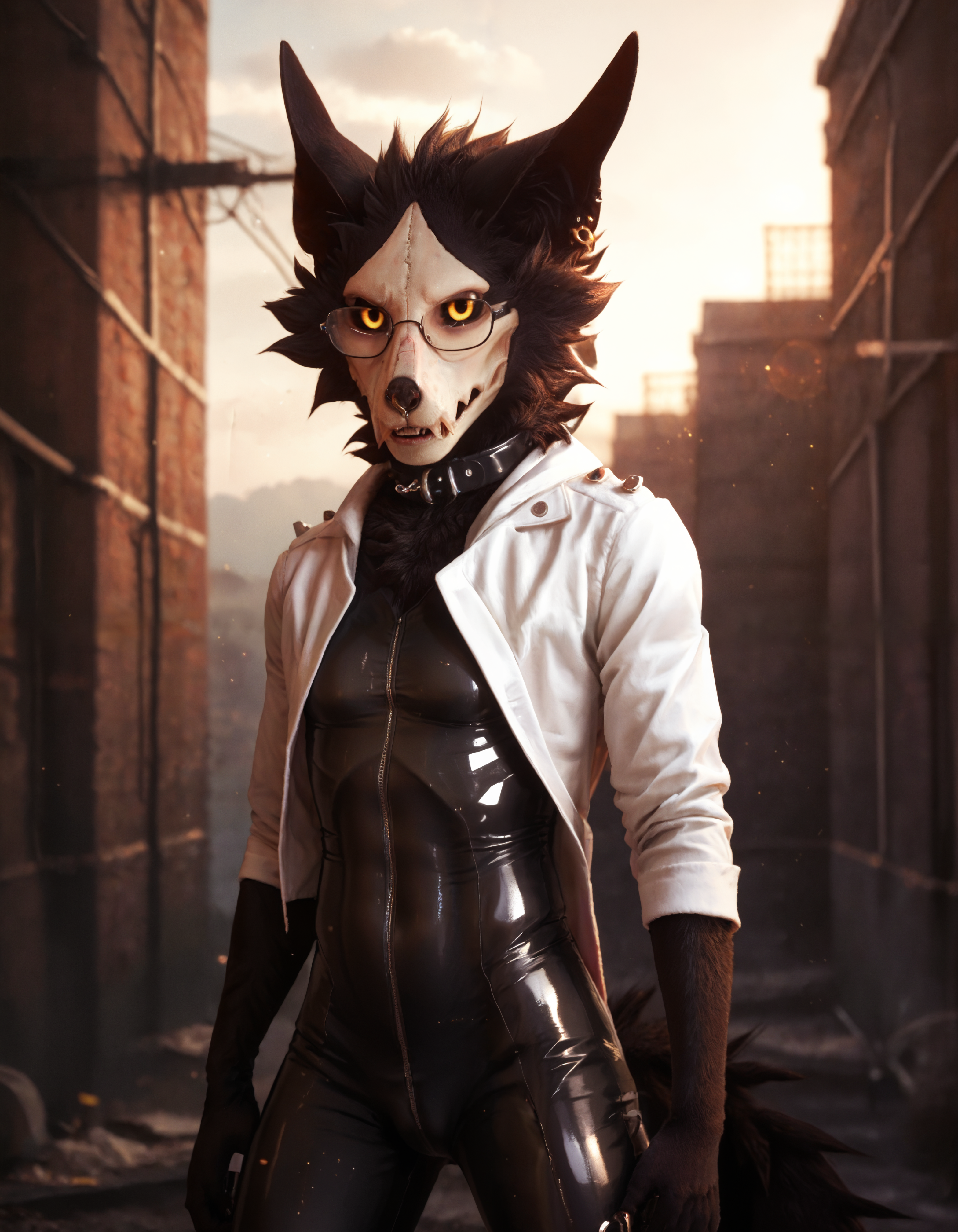 cadaver_skulld0g, solo, anthro, 1boy, male, male focus, fur, yellow eyes, skull head, furry male, tail, claws, animal ears, furry, glowing eyes, digitigrade, clothing, jacket, hoodie